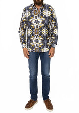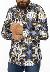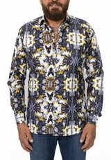 Hypnotic and unique, the abstract art featured on this Italian dress shirt is nothing short of captivating. Accented with trails of gold, the black and white print exudes elegance.