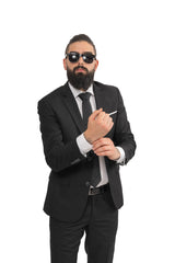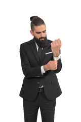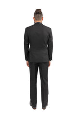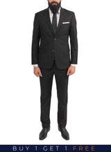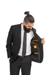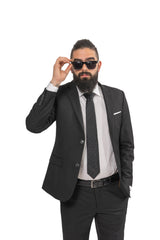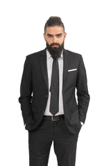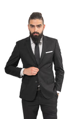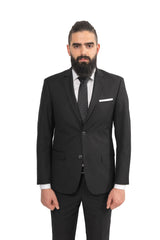 Crafted from fine Italian fabrics, this slim fit designer men’s suit in a classic shade of black is suitable for business or special events.