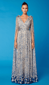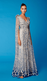 Turn heads in this Cosiani cream and blue polka dot gown, made in Spain, a statement piece of timeless elegance. Designed with a deep V-neckline, cinched waist, and dramatic cape sleeves, this floor-length gown blends sophistication with modern artistry. Perfect for galas, weddings, and formal events, its flowing silhouette and lightweight fabric ensure comfort and unforgettable style.