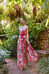 Introducing the "Cosiani Floral Pleated Gown" – a breathtaking ensemble designed to captivate hearts and turn heads. This made in Spain off-shoulder gown boasts vibrant patterns of pink, red, teal, and orange, exuding an air of bold sophistication and undeniable allure. Crafted with meticulous attention to detail, its pleated design adds depth and dimension, while the off-shoulder neckline accentuates your elegance and grace.