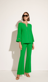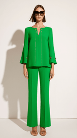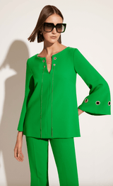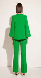 Stand out in this vibrant Cosiani Green Blouse & Trouser Set, crafted in Spain. Featuring a chic flared-sleeve blouse with gold grommet detailing and tailored flared trousers, this set blends timeless sophistication with modern elegance. Perfect for special occasions, events, or statement everyday style.