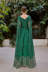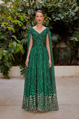 Introducing the "Cosiani Green Printed Gown" – a captivating fusion of elegance and vibrancy. This stunning made in Spain gown features a vibrant green hue with a striking black pattern throughout, reminiscent of butterfly wings in motion. The sage green bottom adds a touch of sophistication to the ensemble. The gown boasts a V-cut chest opening, adding a hint of allure to the silhouette. The arms are elegantly showcased, yet covered with the same dress fabric, which cascades down loosely, providing coverage to the shoulders and upper part of the arms.