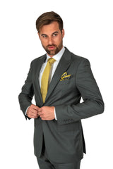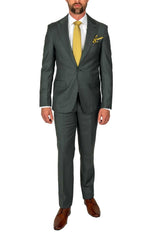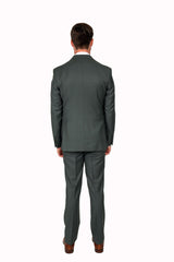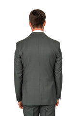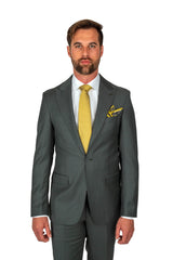 Crafted from a fine Italian wool and silk blend, this slim fit designer men’s suit in a classic shade of olive green is suitable for business or special events.