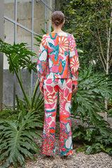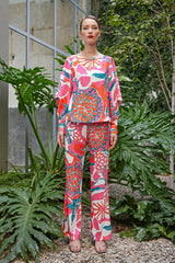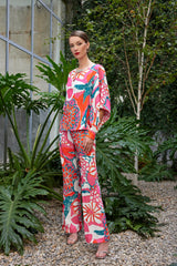 Introducing the "Cosiani Vibrant Blouse & Trouser Set" – a perfect harmony of style and sophistication. This made in Spain matching set features a stunning blouse and trouser adorned with vibrant floral patterns in shades of red, orange, teal, pink, and white, offering a burst of color and charm. The blouse boasts a small V opening at the chest, while a delicate touch of white stones above the V-neck opening adds a touch of elegance and refinement. With loose arms and openings, the blouse ensures both comfort and style.