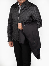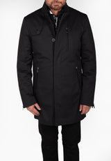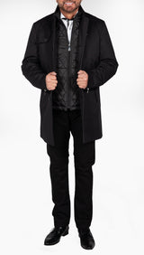 This elegant Cosiani coat is a unique piece as it has 2 jackets in 1- A black button down coat with a removable short patterned black jacket. This windbreaker coat is made to keep you warm despite its featherweight.