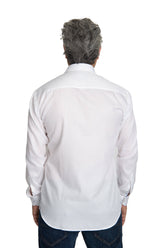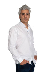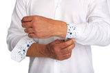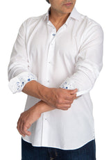 This white shirt flaunts a soft tweedy pattern, clear buttons and under the cuff peekaboo pops of blue paint splatter.
