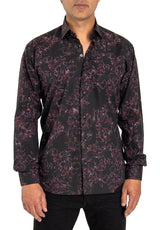 A rich and sumptuous shade of deep scarlet, the exotic flower print featured on this black dress shirt blossoms botanic wonder.