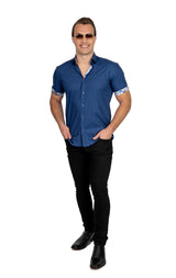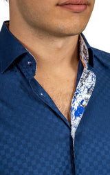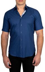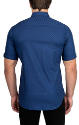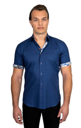 This short sleeve navy blue collared shirt for men comes veiled with a tonal checkered pattern and contrast trims throughout for extra flare.