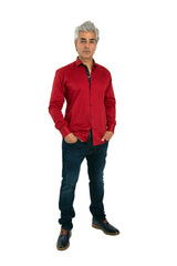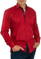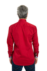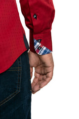 Embellished with dotted texture, navy blue buttons and matching peekaboo trim for contrast, this red shirt is well suited for modern men.