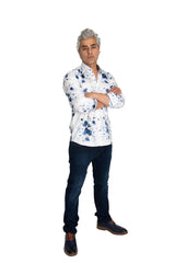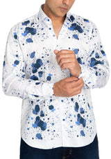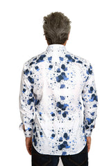 Pops of blue paint splatter have been dispersed throughout the design of this white dress shirt to ‘splash’ out creative style.