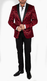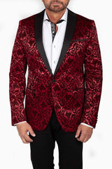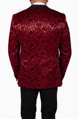 Elaborate, exquisite and elegantly refined, the intricate labyrinth of jacquard textures applied to this dark red suit coat drum up a lavish display of eccentricity.