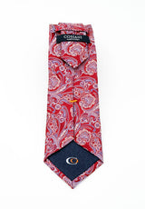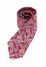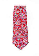 Embrace timeless style with our Red Paisley Silk Tie. Featuring a bold red base adorned with intricate blue and white paisley designs, this tie exudes classic sophistication. Handcrafted with care, it adds a touch of elegance to any ensemble. Elevate your look effortlessly with this exquisite accessory.