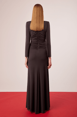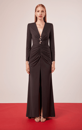 Step into timeless sophistication with this Cosiani black long sleeve gown, made in Spain. Featuring a plunging neckline with jeweled accents, ruched detailing, and a thigh-high slit, this gown is designed for galas, formal evenings, and black-tie events