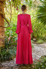 Introducing the "Cosiani Fuchsia Long Sleeve Pleated Gown" – a stunning embodiment of elegance and vibrancy. This made in Spain gown features a captivating vibrant fuchsia hue that commands attention, complemented by long sleeves and graceful pleats. With looser arms, it offers both style and comfort for any occasion. Adding a touch of refinement, the gown includes a tone-on-tone belt with a gold square shiny buckle at the waist, accentuating your silhouette with sophistication and glamour.
