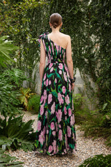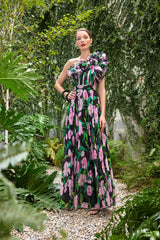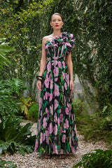 Introducing the "Cosiani Black Floral Pleated Gown" – a striking fusion of elegance and bold sophistication. Made in Spain, this gown has a black base adorned with vibrant floral patterns in pink, with green stems and leaves; a true vision of botanical beauty. Its pleated design adds depth and texture, while the off-shoulder and sleeveless style exudes contemporary charm. Adding a touch of whimsy, a beautiful ruffled fabric cascades from the top left shoulder down to the right shoulder, enhancing the gown's allure and movement.