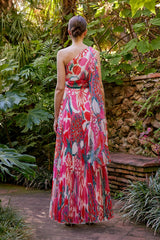 Introducing the "Cosiani Floral Pleated Gown" – a breathtaking ensemble designed to captivate hearts and turn heads. This made in Spain off-shoulder gown boasts vibrant patterns of pink, red, teal, and orange, exuding an air of bold sophistication and undeniable allure. Crafted with meticulous attention to detail, its pleated design adds depth and dimension, while the off-shoulder neckline accentuates your elegance and grace.